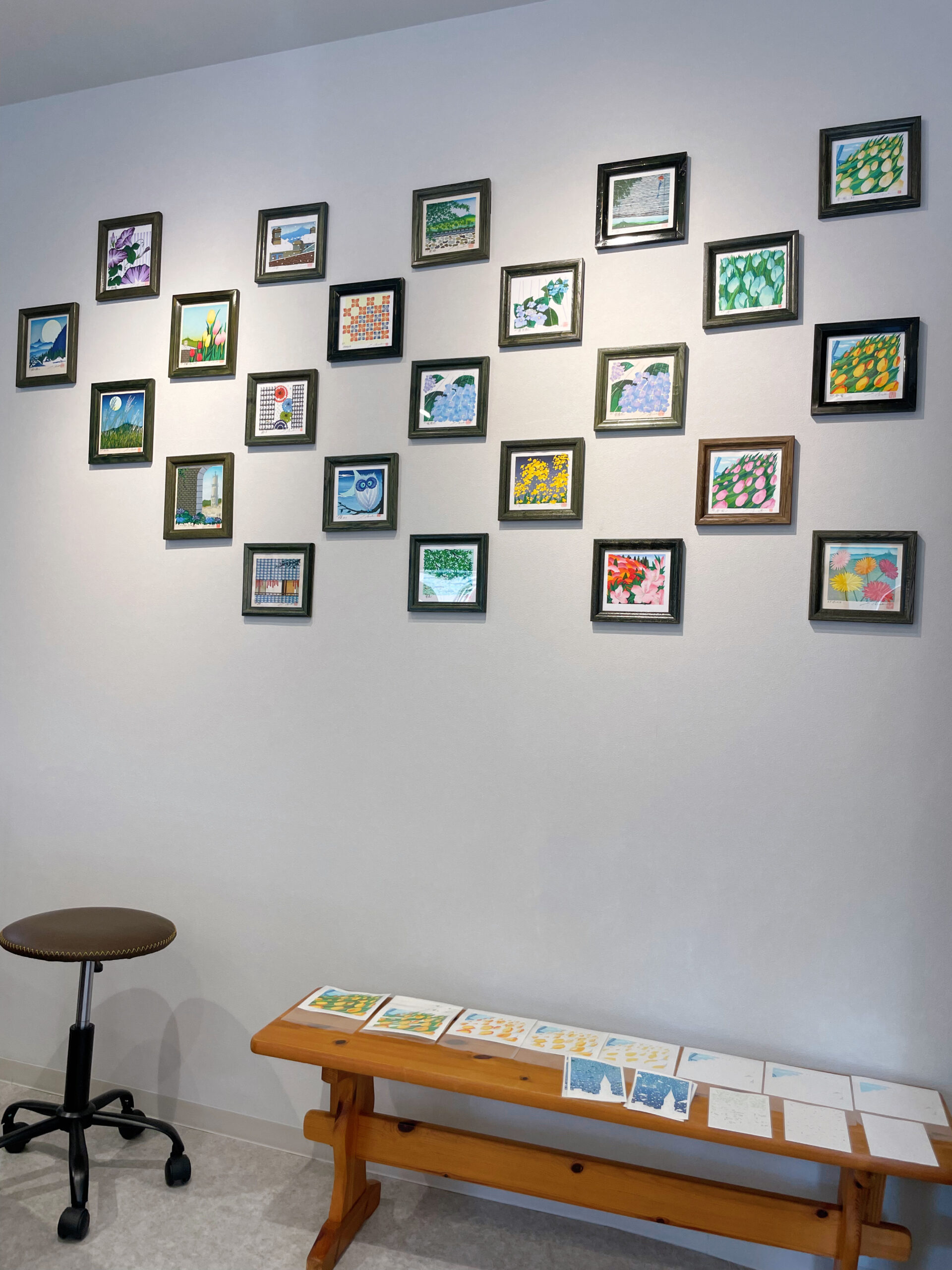 更に、音楽とアートを組み合わせる活用予定から、メイン壁中央には作家所有のピアノを設置。元々の画廊壁に設置されていたテーブル板を二等分に割って、ピアノ左右に配置することで、ピクチャーレールのほか机上にも展示空間を確保。また一部のサイド壁は、マグネットボードを仕込むことで、小型木板画を自在に配置できるように。